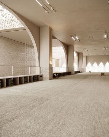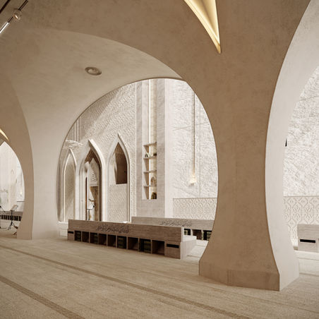 A palette of sandy neutrals, marble accents, and touches of gold creates an ambiance of purity and sophistication, lending an air of refined elegance and connection to the earth’s richness. These elements form a cohesive vision of calm, elevating the mosque into a sanctuary exuding of timeless beauty.